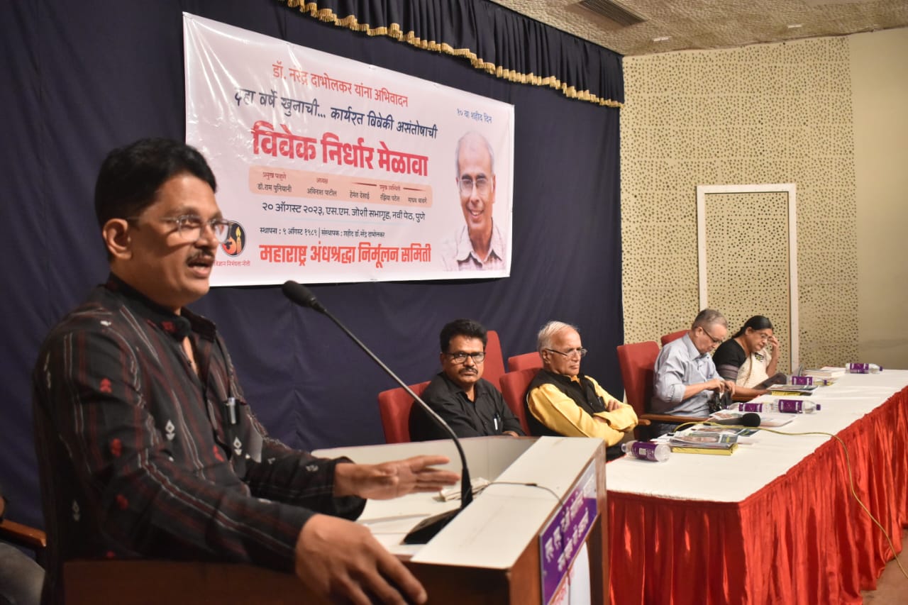 डॉ. नरेंद्र दाभोलकर यांच्या स्मृतिदिनानिमित्त एस एम जोशी सभागृह येथे विवेक निर्धार मेळावा झाला. यावेळी अविनाश पाटील बोलत होते. या मेळाव्याला प्रमुख पाहुणे म्हणून ज्येष्ठ विचारवंत डॉ. राम पुनियानी, ज्येष्ठ कामगार नेते डॉ. बाबा आढाव, ज्येष्ठ पत्रकार हेमंत देसाई, रझिया पटेल, महा.अंनिसचे राज्य कार्याध्यक्ष माधव बागवे यांच्यासह कार्यकर्ते मोठ्या संख्येने उपस्थित होते.