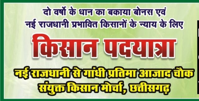 रायपुर(दि.1ऑक्टोबर):- संयुक्त किसान मोर्चा के आह्वान पर नया रायपुर के विस्थापन प्रभावित किसानों को न्याय देने तथा पिछले भाजपा राज के बकाया बोनस को तत्काल अदा करने की मांग पर सैकड़ों किसान कल 2 अक्टूबर को नया रायपुर से पदयात्रा करेंगे तथा रायपुर में आजाद चौक स्थित गांधी प्रतिमा पर माल्यार्पण करेंगे।
