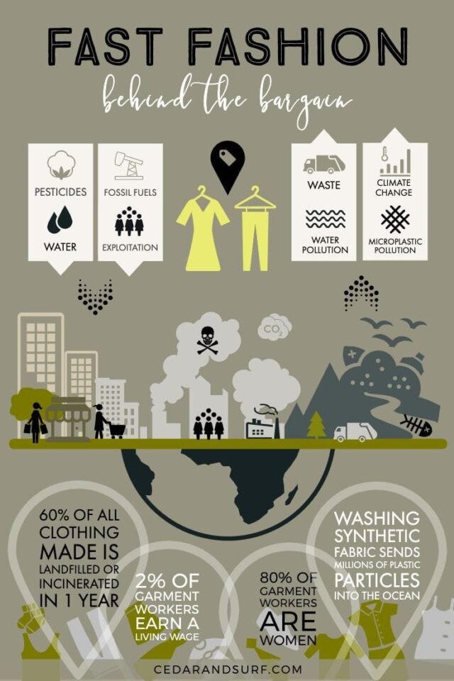 संयुक्त राष्ट्र पर्यावरण कार्यक्रम के अनुसार फैशन उद्योग वैश्विक अपशिष्ट जल के 20% और कार्बन उत्सर्जन के 10% के लिए जिम्मेदार है, परिधान के लिए उपयोग की जाने वाली लगभग 60% आधुनिक सामग्रियां सिंथेटिक हैं, जिससे हर साल पांच लाख टन माइक्रोफाइबर समुद्र में छोड़े जाते हैं।