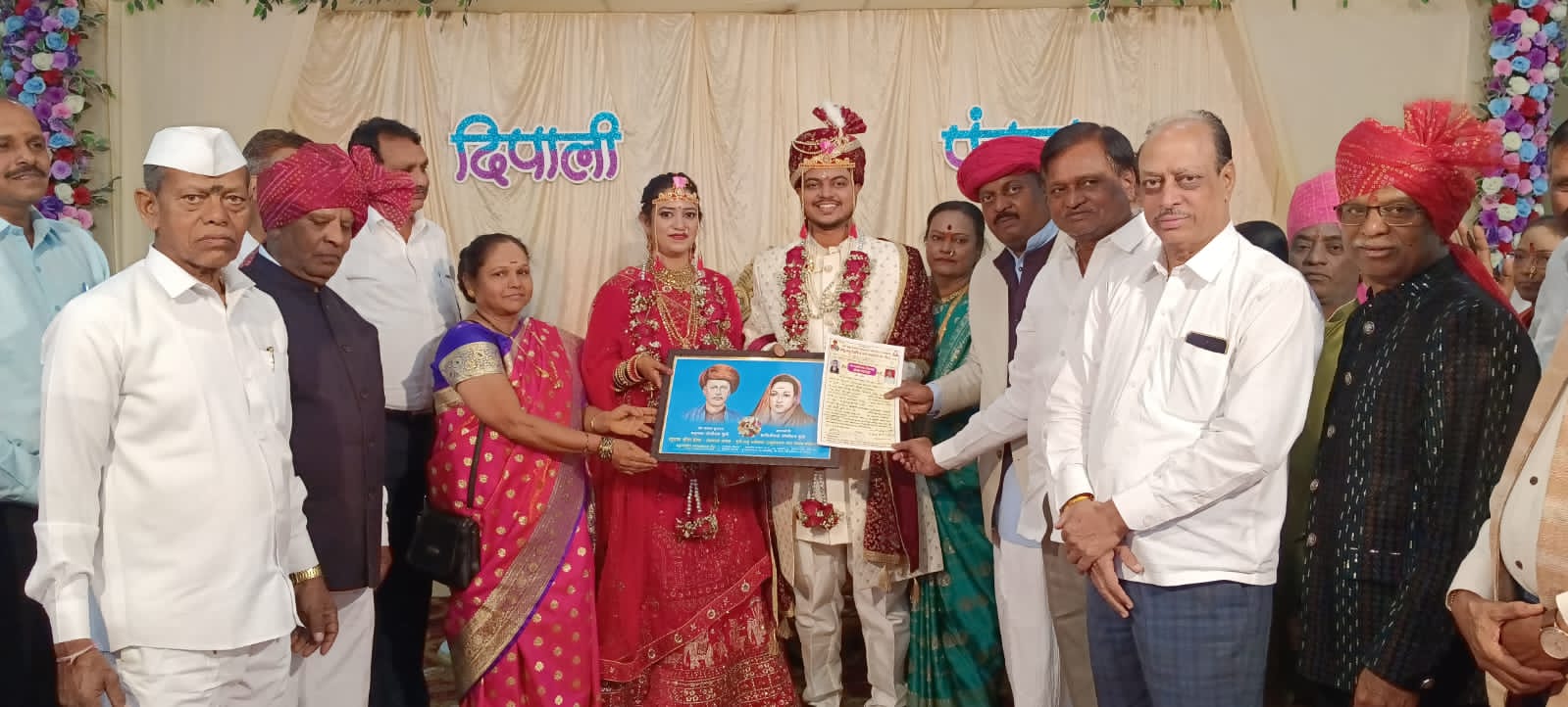 यावेळी वधू वर याना सत्यशोधक विवाह प्रमाणपत्र आणि थोर समाज सुधारक महात्मा फुले आणि सावित्रीबाई फुले यांची फोटो फ्रेम जेष्ठ माजी नगरसेवक वसंत नाना लोंढे व उद्योजक तुकाराम शेठ कांडगे आणि ढोक यांचे शुभहस्ते भेट देण्यात आले.तर वधू वर यांचे आई वडील व मामा मामी यांना राष्ट्रीय ओबीसी महासंघाचे वतीने सन्मान पत्र मान्यवरांचे हस्ते देण्यात आले. या प्रसंगी वसंत लोंढे यांनी महात्मा फुले यांनी लावलेल्या लग्नाची व दक्षिणा साठी कोर्टात केस कशी चालली आणि कशी जिंकली याची सत्य कथा सांगत मौलिक मार्गदर्शन करीत आहेर आणि शेवकरी परिवाराचे हा आदर्श विवाह सोहळा पार पाडला म्हणून आभार मानले.