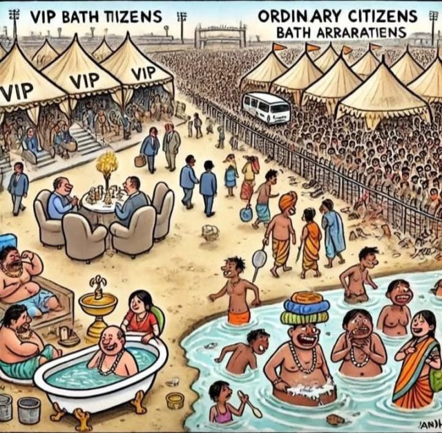 बहरहाल, मौतों तथा घटनाक्रम के सरकारी दावों पर सवाल खड़े करने वाली तमाम रिपोर्टों तथा सामने आयी तमाम जानकारियों का योगी सरकार ने नोटिस तक लेने से इंकार कर दिया और सारी खबरों की ओर से आंख-कान बंद कर के सरकार, इस उम्मीद में कि उसके प्रचार के सामने सब कुछ भुला दिया जाएगा, सब कुछ सुचारु रूप से चल रहा होने का अपना ढोल पीटने में लग गयी। इसी के हिस्से के तौर पर पहले उप-राष्ट्रपति और फिर राष्ट्रपति को ही नहीं, देश के सबसे बड़े धनपतियों में से एक, अंबानी परिवार को बाकायदा वीवीआईपी स्नान कराया गया। उप-राष्ट्रपति ने तो भगदड़ में तीस मौतों की बात तब तक स्वीकार कर लिए जाने के बावजूद, कुंभ की व्यवस्थाओं को न भूतो न भविष्यति का बाकायदा सर्टिफिकेट ही दे दिया था। जाहिर है कि सत्ता के शीर्ष पर बैठे या उनसे जुड़े लोगों के वीवीआईपी दर्जे पर, खूनी भगदड़ के बाद जारी इस सरकारी आदेश का कोई प्रभाव नहीं पड़ने वाला था कि सारे वीआईपी पास निरस्त किए जाते हैं। वास्तव में, विभिन्न रिपोर्टों में प्रयागराज में हुई भगदड़ के मुख्य कारणों में कुंभ की वीआईपी संचालित व्यवस्था को सबसे प्रमुख माना गया था, जिसमें मेला क्षेत्र और रास्तों के बड़े हिस्से को, वीआईपी गण के लिए सुरक्षित करने के जरिए, आम श्रद्घालुओं के लिए उपलब्ध जगह और रास्तों को, उनकी भारी भीड़ को देखते हुए, और भी छोटा कर दिया गया था।