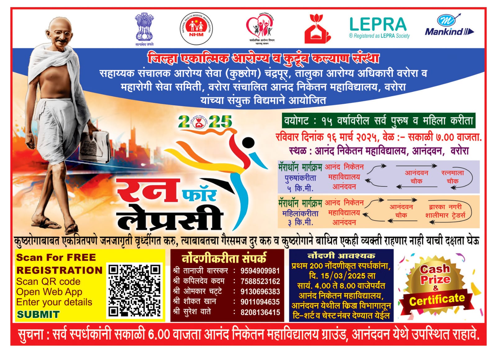 चद्रपूर(दि. 13 मार्च ):-सन 2027 पर्यंत कुष्ठरोगाचे निर्मूलन करण्याकरीता चंद्रपूर जिल्हयात स्पर्श -2025 अंतर्गत कुष्ठरोग जनजागृती अभियान राबविण्यात येत आहे. यात विविध शैक्षणिक उपक्रम राबविण्यात येत असून त्या अनुषंगाने सहाय्यक संचालक (कुष्ठरोग) चंद्रपूर, तालुका आरोग्य अधिकारी, वरोरा व महारोगी सेवा समिती संचालीत आनंद निकेतन महाविद्यालय यांच्या संयुक्त विद्यमानाने ‘रन फॉर लेप्रसी’ मॅराथॅानचे आयोजन 16 मार्च 2025 ला सकाळी 7 वाजता आनंदनिकेतन महाविद्यालय, आनंदवन येथे करण्यात आलेले आहे. स्पर्धकांनी सकाळी 6.30 वाजता मॅराथॉन ठिकाणी उपस्थित राहावे