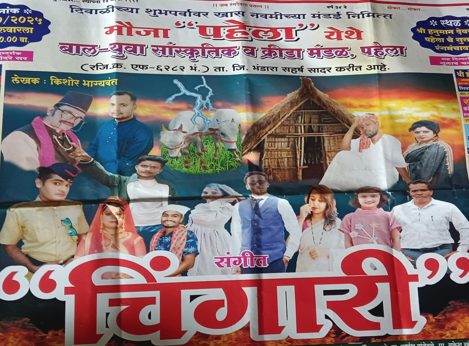 भंडारा(दि.24ऑक्टोबर):-तालुक्यातील मौजा पहेला येथे बाल युवा सांस्कृतिक व क्रीडा मंडळ च्या वतीने दिवाळीच्या शुभ पर्वावर खास नवमीच्या मंडई निमित्त 30 ऑक्टोबर 2025 ला रात्री ९ वाजता रोज गुरुवारला मोफत संगीत चिंगारी नाटक व सत्कार सोहळ्याचे आयोजन श्री हनुमान देवस्थान येथील रंगमंचकावर करण्यात आलेले आहे. वरील नाटकाचे उद्घाटन कविताताई उईके अध्यक्ष जिल्हा परिषद भंडारा, सहउद्घाटक सुभाष आजबले अध्यक्ष सहकारी पतसंस्था वाकेश्वर, कार्यक्रमाचे अध्यक्ष दयानंद नखाते अध्यक्ष हनुमान देवस्थान कमिटी, दीप प्रज्वलन काजल चवळे पंचायत समिती सदस्या ,दीपक वानखेडे उद्योजक राईस मिल पागोरा, ओमप्रकाश नकाते, देवानंद वैरागडे ,यांचे उपस्थितीत होईल.