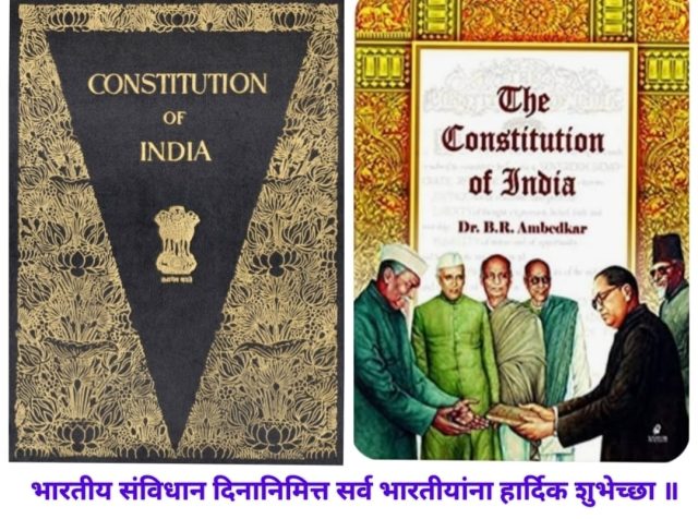 भारतीय संविधान हे लिखित स्वरूपातील जगातील सर्वात मोठे संविधान आहे.ते भारताला एक सार्वभौम, समाजवादी,धर्मनिरपेक्ष, लोकशाही प्रजासत्ताक म्हणून स्थापित करते.भारतीय संविधानाला दि.२६ नोव्हेंबर १९४९ रोजी संविधान सभेने ते स्वीकारले,म्हणून या दिवसाला ‘संविधान दिन’ (Constitution Day) म्हणून ओळखले जाते.सविधान दिनानिमित्त सर्व नागरिकांना हार्दिक शुभेच्छा ॥