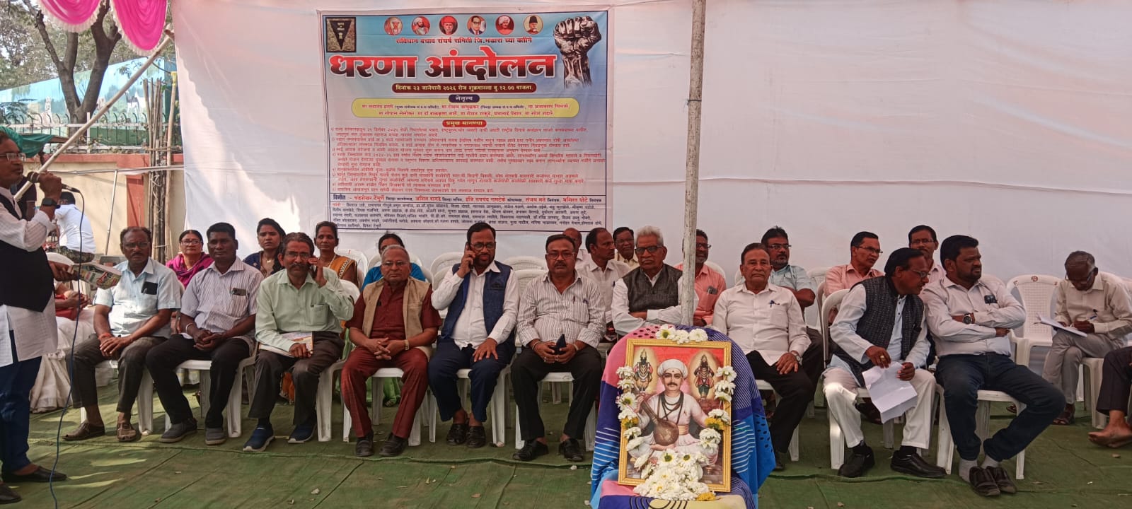भंडारा(दि.24जानेवारी):-संविधान बचाव संघर्ष समिती जिल्हा भंडारा च्या वतीने ज्वलंत मागण्यांना घेऊन भंडारा जिल्हाधिकारी कार्यालय समोर एक दिवसीय धरणे आंदोलन दिनांक २३ जानेवारी २०२६ रोज शुक्रवार १२ वाजेपासून सायंकाळी ५ वाजेपर्यं त करण्यात आले. सर्वप्रथम जगद्गुरु संत तुकाराम महाराज यांच्या प्रतिमेचे पूजन करून त्यांना अभिवादन करण्यात आले.या धरणे आंदोलनाचे नेतृत्व सदानंद इलमे मुख्य संयोजक संविधान बचाव संघर्ष समिती , संविधान बचाव संघर्ष समितीचे जिल्हाध्यक्ष रोशन जांभुळकर ,अजबराव चिचामे ,गोपाल सेलोकर, डॉ.बाळकृष्ण सार्वे ,रोशन उरकुडे, प्रतिभाताई पेंदाम ,रमेश शहारे माजी समाज कल्याण सभापती चंद्रशेखर चंद्रशेखर टेंभुर्णे, संविधान बचाव संघर्ष समितीचे भंडारा जिल्हा महासचिव आसिद्ध बागडे,यांच्या नेतृत्वात करण्यात आले.