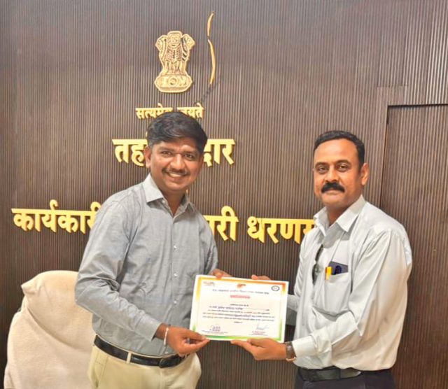 यामध्ये धरणगाव शहरात महात्मा फुले हायस्कूल धरणगाव शाळेचे उपशिक्षक तथा यादी भाग क्रमांक १९९ चे मतदान केंद्रस्तरीय अधिकारी पी डी पाटील यांना तहसिलदार महेंद्र सूर्यवंशी यांच्या शुभहस्ते उत्कृष्ट BLO पुरस्कार देऊन सन्मानित करण्यात आले.
