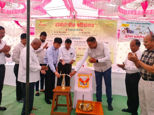 जळगाव(दि.१९फेब्रुवारी):- जैन फार्म फ्रेश फूड्स लि. (जैन इरिगेशन सिस्टीम्सची उपकंपनी) आणि कागोमे इंडिया प्रा. लि. यांच्या संयुक्त विद्यमाने आयोजित ‘टोमॅटो पिक परिसंवाद’ संपन्न झाला. पिंगळवाडे मुडी रोडवरील प्रगतशील शेतकरी चंद्रकांत वसंत पाटील यांच्या शेतात हा कार्यक्रम झाला. पंचक्रोशीतील शेतकऱ्यांनी मोठ्या संख्येने उपस्थिती लावून या परिसंवादास उत्स्फूर्त प्रतिसाद दिला. आधुनिक तंत्रज्ञानाच्या साहाय्याने टोमॅटो उत्पादन वाढवण्यासाठी हा परिसंवाद मार्गदर्शक ठरला.