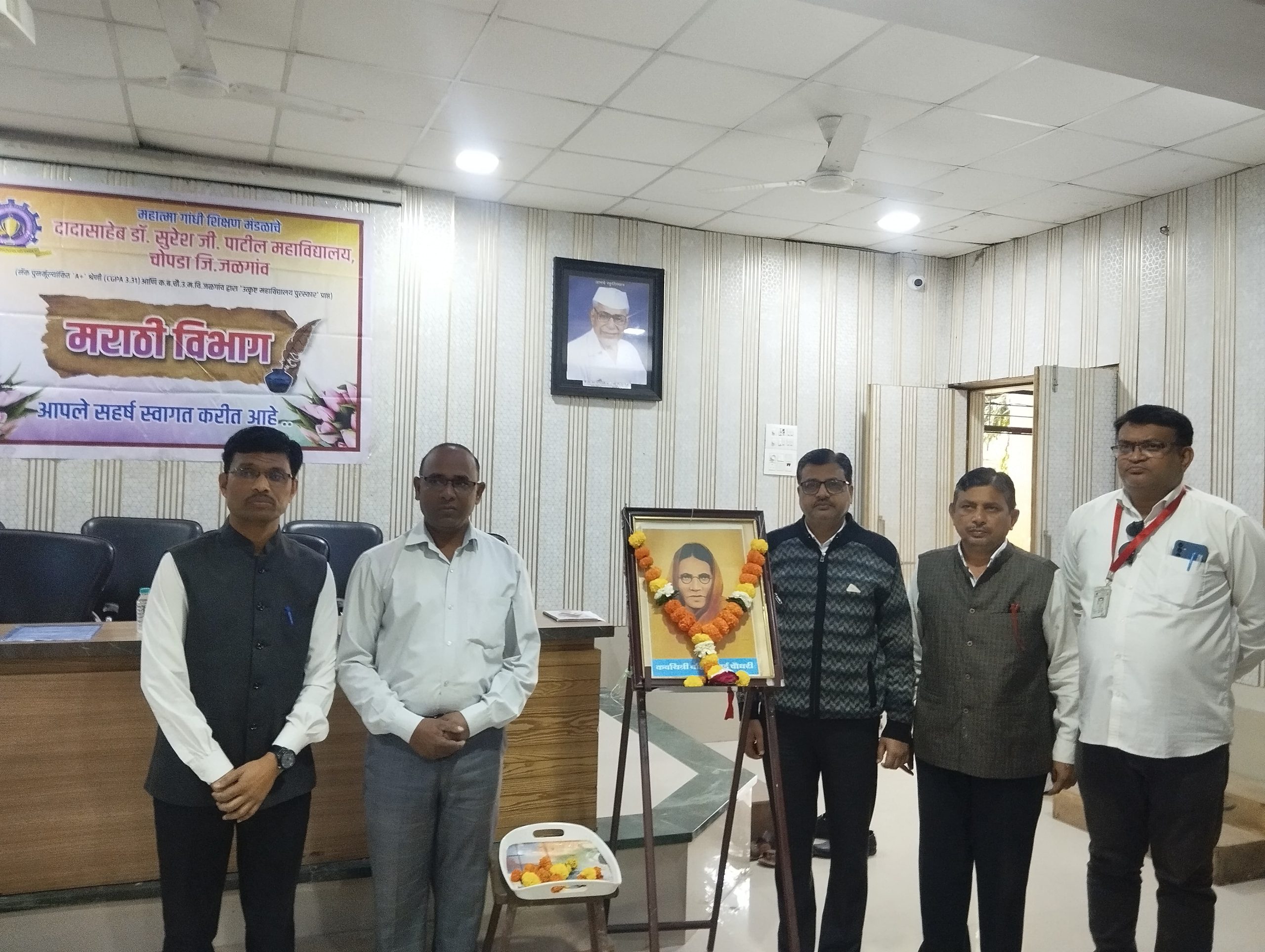 या कार्यक्रमाच्या अध्यक्षस्थानी महाविद्यालयाचे प्राचार्य प्रा. डॉ. के. एन. सोनवणे हे उपस्थित होते. या कार्यक्रमाप्रसंगी प्रमुख वक्ते म्हणून शिरपूर येथील आर.सी.पटेल महिला महाविद्यालयाचे सहा.प्राध्यापक तसेच साहित्यिक व कादंबरीकार डॉ. युवराज पवार, महाविद्यालयाचे उपप्राचार्य प्रा. डॉ. ए. बी. सूर्यवंशी, महाविद्यालयाचे समन्वयक डॉ. शैलेशकुमार वाघ आदी मान्यवर उपस्थित होते.