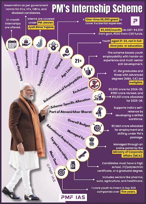 कॉर्पोरेट व्यवहार मंत्रालय अंतर्गत पाच वर्षात एक कोटी तरूणांना रोजगारक्षम बनविण्यासाठी इंटर्नशिपची संधी उपलब्ध करून देणे, हा या योजनेचा मुख्य उद्देश आहे. प्रत्येक उमेदवारांना प्रति महिना 9 हजार रूपये देण्यात येणार असून इंटर्नशिपचा कालावधी 6 किंवा 9 महिने आहे. भारत सरकार प्रधानमंत्री जीवन ज्योती विमा योजना आणि प्रधानमंत्री सुरक्षा विमा योजनेअंतर्गत या प्रशिक्षणार्थी साठी विमा कवच देखील दिले जाणार आहे. ज्या उमेदवारांचे वय 21 ते 25 वर्ष आहे, असे पुर्णवेळ शिक्षण किंवा रोजगार नसलेल्या बेरोजगार तरुणासाठी ही संधी आहे.