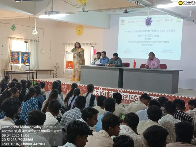 चिमूर(दि.9एप्रिल):-ग्रामगीता महाविद्यालय चिमूर येथे सामाजिक न्याय व विशेष सहाय्य विभाग, महाराष्ट्र शासन यांचे निर्णयानुसार तसेच गोंडवाना विद्यापीठ, गडचिरोली यांच्या परिपत्रकानुसार दिनांक 8 एप्रिल 2026 ते 14 एप्रिल 2020 या कालावधीत “भारतरत्न, डॉ. बाबासाहेब आंबेडकर सामाजिक समता सप्ताह” अंतर्गत विविध कार्यक्रमांचे आयोजन करण्यात आले आहे. दिनांक 8 एप्रिल 2026 ला या सप्ताहाचे उद्घाटनाप्रसंगी भारतीय संविधानाचे उद्देशिकेचे वाचन करण्यात आले व सामाजिक समता कार्यक्रमानिमित्त विद्यार्थ्यांना कार्यक्रमांची रूपरेषा सांगण्यात आली.