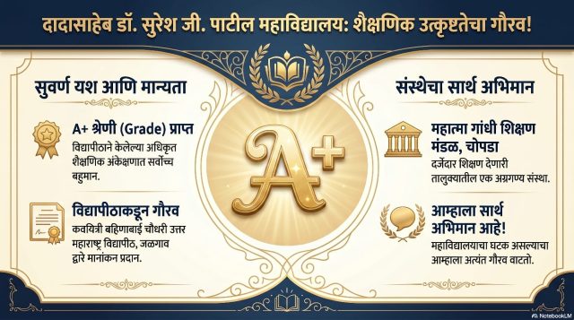 चोपडा(दि.26एप्रिल):-कवयित्री बहिणाबाई चौधरी उत्तर महाराष्ट्र विद्यापीठ जळगाव अंतर्गत असलेल्या महाविद्यालये आणि परिसंस्थांचे दर तीन वर्षांनी शैक्षणिक अंकेक्षण अर्थात अकॅडेमिक ऑडिट केले जाते. या अकॅडेमिक ऑडिटमध्ये दादासाहेब डॉ. सुरेश जी.पाटील महाविद्यालयाला ‘अ+’ श्रेणी प्राप्त झाली आहे.