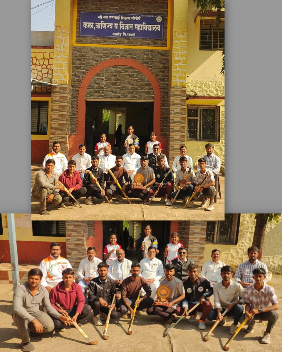 गंगाखेड(दि.27डिसेंबर):- येथील श्री संत जनाबाई महाविद्यालय कनिष्ठ व वरिष्ठ विभागाच्या विद्यार्थ्यांनी विविध क्रीडा स्पर्धांमध्ये घवघवीत यश संपादन करून महाविद्यालयाच्या क्रीडा परंपरेचा गौरव वाढवला आहे. दिनांक २४ डिसेंबर रोजी स्वामी रामानंद तीर्थ मराठवाडा विद्यापीठ,नांदेड यांच्या अंतर्गत आयोजित आंतरमहाविद्यालयीन सेंट्रल झोन हॉकी क्रीडा स्पर्धेत श्री संत जनाबाई महाविद्यालयाच्या वरिष्ठ विभागाच्या मुलांच्या हॉकी संघाने उत्कृष्ट खेळाचे प्रदर्शन करत तृतीय क्रमांक पटकावला.